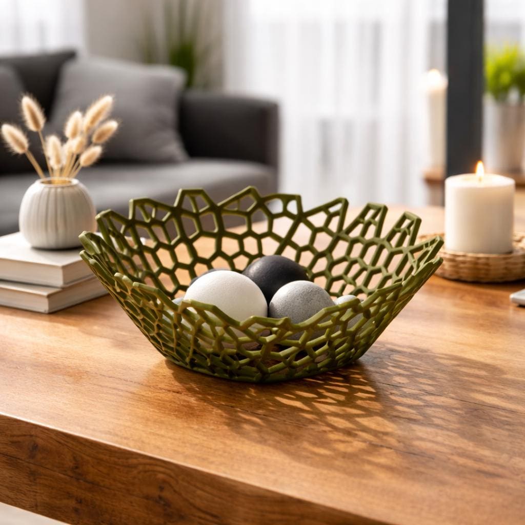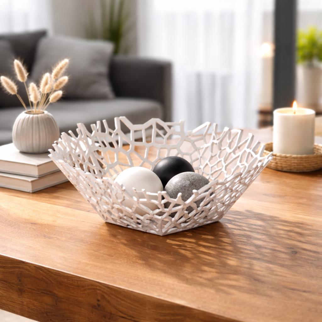The open mesh structure not only highlights the form but also creates beautiful shadows depending on the lighting — making it more than just a bowl, but a true statement piece.