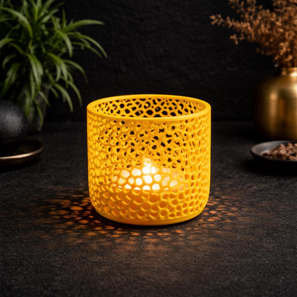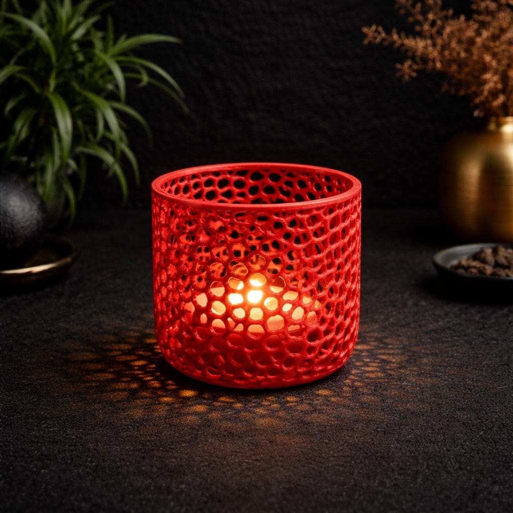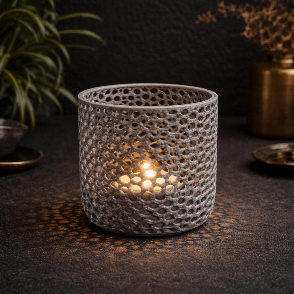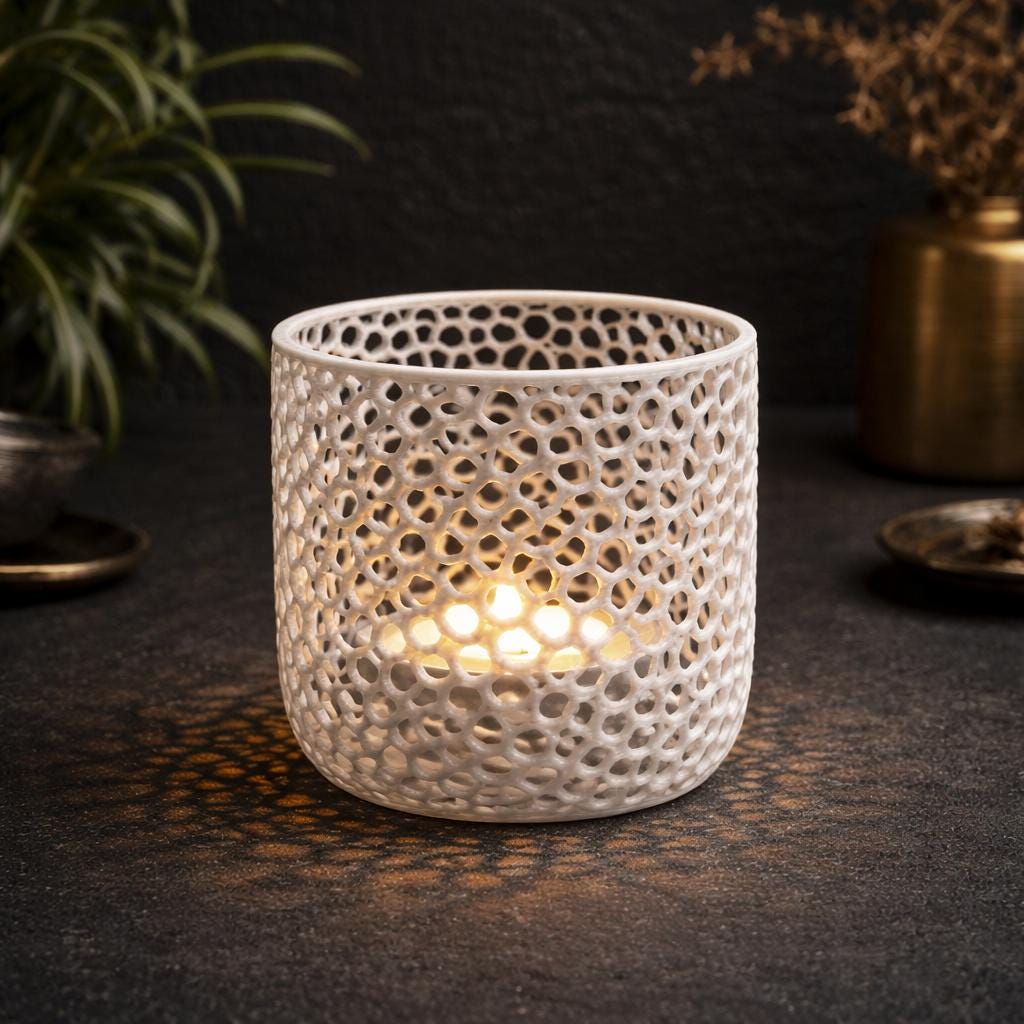Add a warm and modern touch to your home with this 3D printed tealight holder made from high-quality PLA. The organic, lattice-style design creates beautiful light patterns when used with an LED tealight, making it a perfect piece for cozy and stylish interiors.
